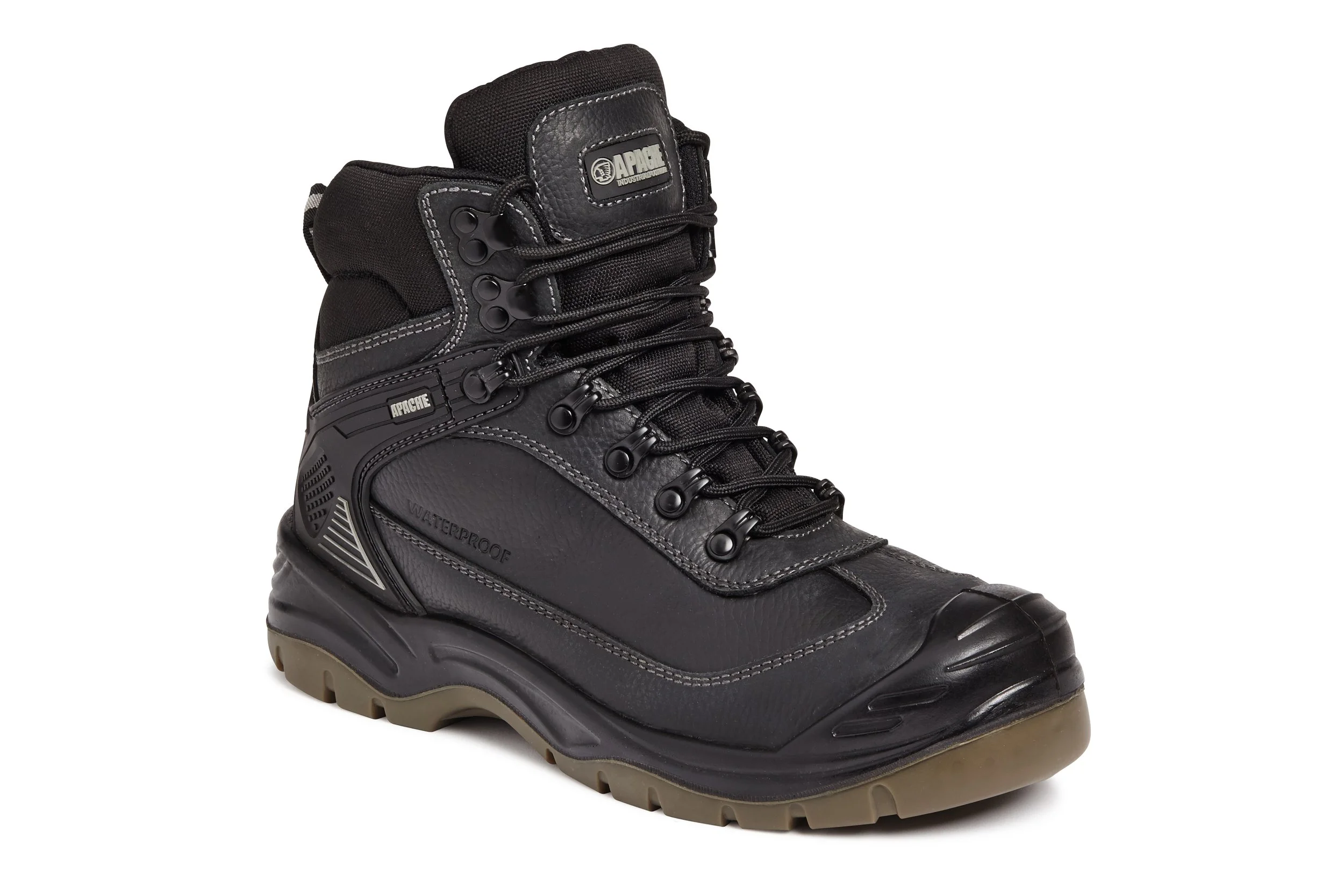 Full grain, black leather, waterproof, safety hiker. Padded collar and tongue for added comfort. Steel toe cap and steel midsole protection. Waterproof and breathable inner lining. Dual density polyurethane outsole with anti-scuff toe guard. Anti-static. TPU Heel support and kick plate. A good all round waterproof safety boot for a wide range of outdoor applications.
